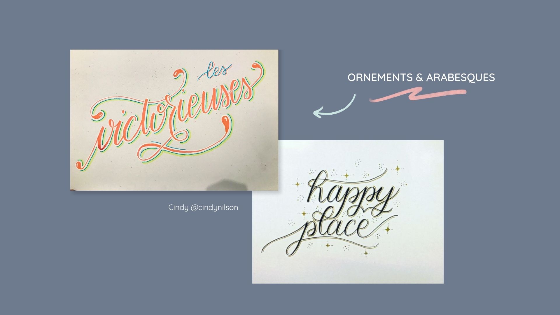 On s'initie ici aux ornements, arabesques, fioritures qui peuvent habiller nos lettrages (le flourishing en anglais, ça te parle ?)
